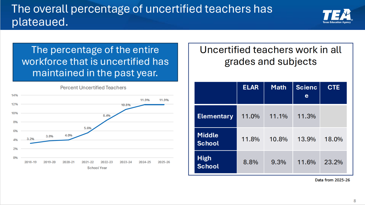 At the same time, the state continues to rely heavily on less traditional pathways. Morath acknowledged the increasing use of alternative certification and uncertified teachers, particularly in recent years. While the percentage of uncertified teachers has “plateaued,” he was clear about where this is most concerning: “Having an uncertified teacher is not problematic in CTE … but … in kindergarten … that’s not necessarily a good thing.”