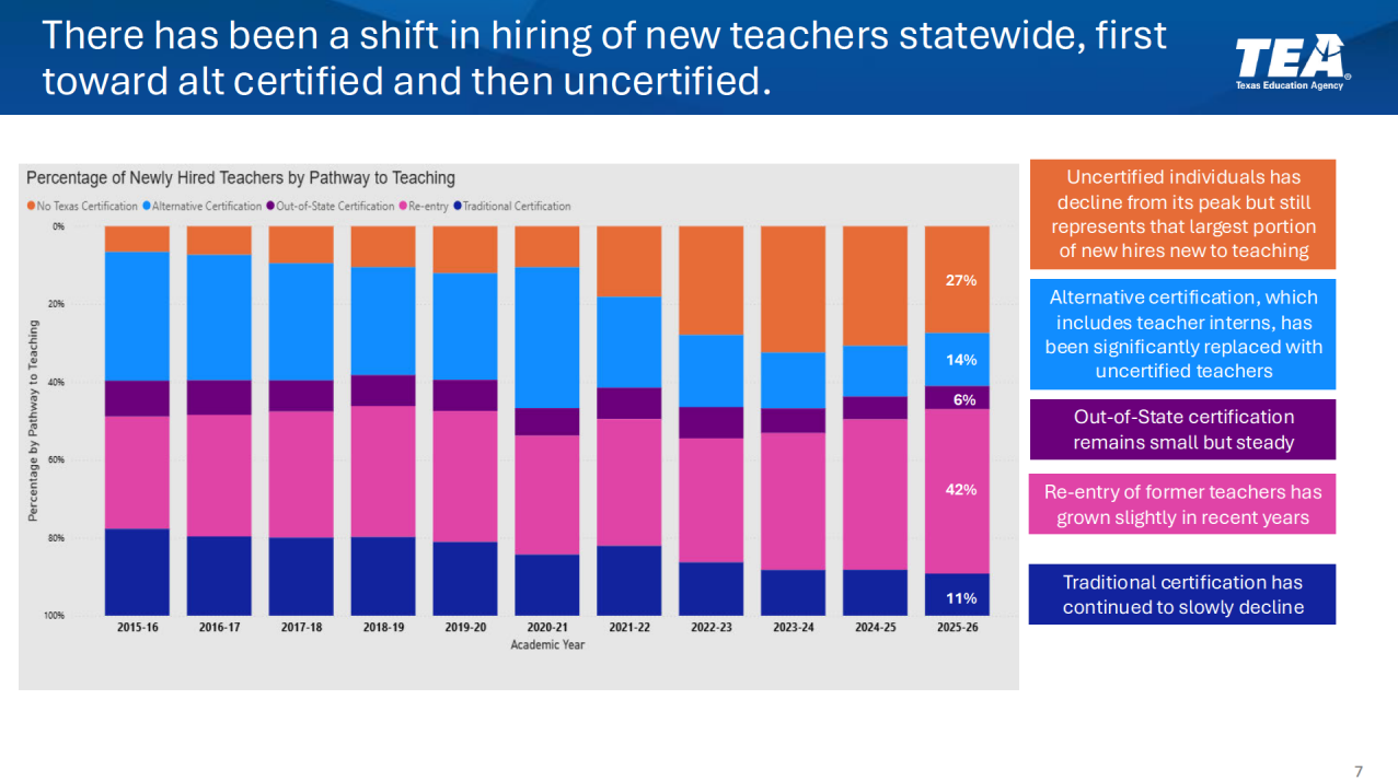 One of the most significant workforce shifts highlighted by Morath was the growing reliance on returning teachers. Educators returning to the profession, many of them experienced teachers coming back after time away, now make up the largest group of new hires, accounting for roughly 42%. “This is someone who actually does have teaching experience … generally a good situation,” he said.