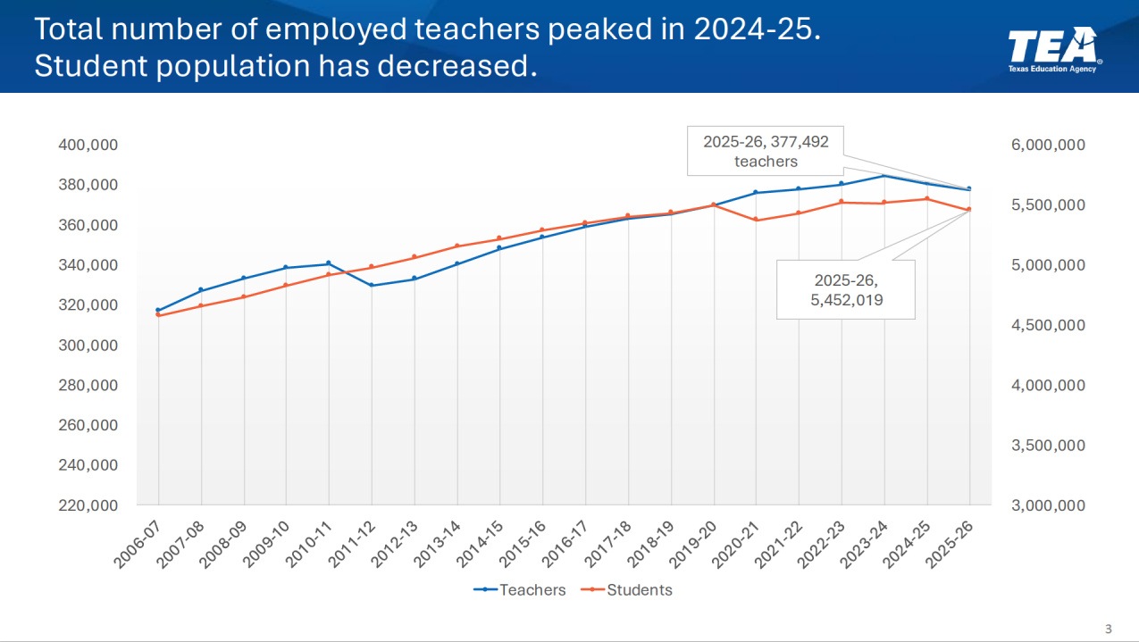 Morath opened by introducing a notable shift in statewide trends showing that while Texas continues to employ more teachers than any other state, student enrollment has declined. “We peaked in [teacher employment] … and since then, there has been more matching … to the student population,” he said, noting the state currently employs more than 377,000 teachers. At the same time, enrollment has dropped by tens of thousands of students in recent years, leading to smaller student-teacher ratios statewide.