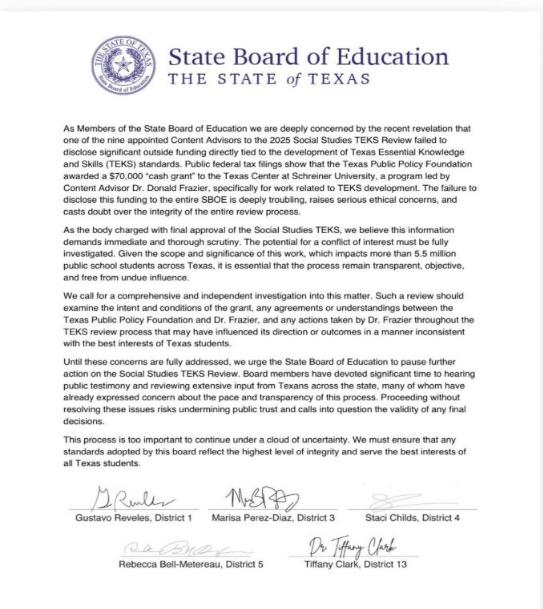 One of the most closely watched issues was continued debate over the development of the Social Studies TEKS and the role of outside contributors. Several SBOE members sent a formal letter raising concerns about the involvement of a Texas Public Policy Foundation (TPPF)-affiliated individual who was reportedly paid to assist in drafting portions of the standards. The letter questioned transparency, potential bias, and the broader precedent of outsourcing curriculum writing to politically affiliated groups.
